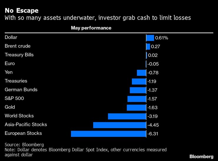 The Bloomberg Dollar Spot Index has trumped all other assets this month, notching a 0.6% advance at a time when stocks and bonds are tumbling. Investors have poured cash into an exchange-traded fund tracking Treasury bills for five weeks, clocking up the biggest inflows since 2020.