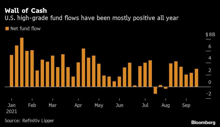 This may all be just a blip. High-grade companies often refrain from selling debt when there are steep moves in bonds, as was the case on Monday, with the 10-year Treasury yield falling by around 0.05 percentage point to 1.31%. China Evergrande is seen by many strategists as only a peripheral concern for the U.S. credit market for now, and all month long corporate debt has rallied even as companies have sold more than $118 billion of high-grade debt in September, an eye-popping amount.