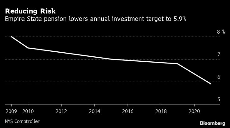 On Wednesday, New York’s $270 billion retirement fund, the third-largest in the U.S., cut its annual target to 5.9% from 6.8% after posting a record 33.5% gain in the most recent fiscal year. California’s Public Employees’ Retirement System -- the biggest in the nation -- along with funds in Maryland, Maine and Idaho have also lowered investment projections in the last two-months, but by smaller amounts.