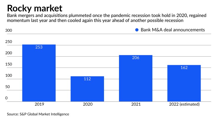 There were just 149 U.S. bank M&A deals announced through November this year, according to S&P Global Market Intelligence's running tally. That put the industry on pace for 162 deals in 2022, a sharp decline from 206 the year before.