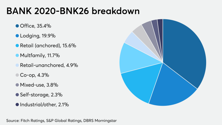 The leading types include 35% backed by office properties, 20.9% in retail, 19.9% lodging and 16.1% multifamily.