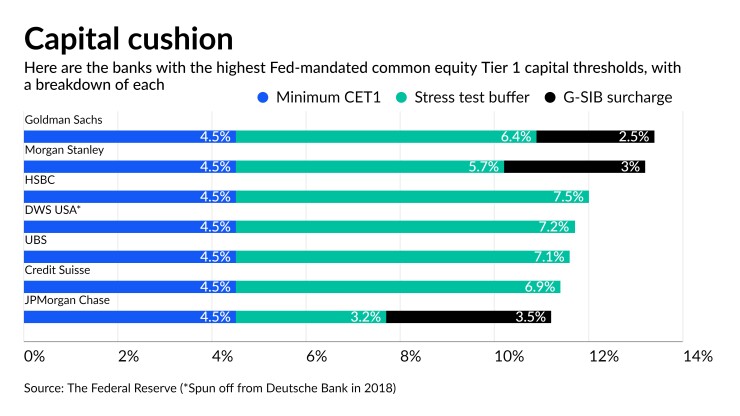 Morgan Stanley will be required to comply with the second-highest capital requirements after Goldman Sachs with a CET1 requirement of 13.2%. HSBC North America has the highest capital requirement among non-U.S. GSIBs at 12%.