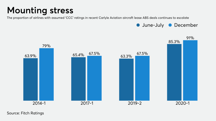 Across Carlyle Aviation’s pools issued via its AASET trust platform, for example, the proportion of airline lessees with highly speculative, near-default ‘CCC’ ratings has grown to between 67.5% to more than 91% for each particular transaction.