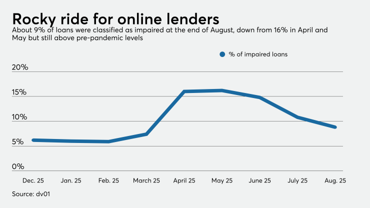 Before the COVID-19 crisis, around 5% to 6% of borrowers with online loans were typically failing to make their regularly scheduled payments, either with or without the blessing of the lender, according to the report. That percentage spiked to 16.5% in early May as many borrowers requested forbearance. By last month, it had declined back to 8.9%.