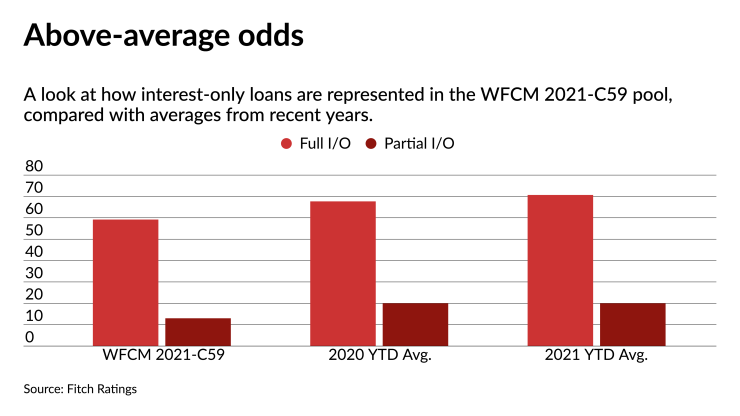 The pool has amortization statistics that are above average. Full interest-only loans account for 59.2% of the pool, which falls below the average of 67.7% through the same period last year, and the 2021 year-to-date average of 70.7%, according to FitchRatings.