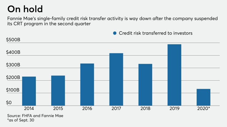 Both companies suspended CRTs in the second quarter when the coronavirus pandemic hit the markets and fewer investors wanted to take on more risk. But whereas Freddie resumed the deals in the third quarter, Fannie did not and says it has no plans to in the short term.