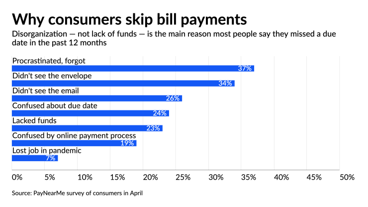 About 25% of consumers said they failed to pay a bill on time because they were confused about the due date or because they lacked funds. Only 7% said they were late paying a bill in the last year because they lost their job in the pandemic.